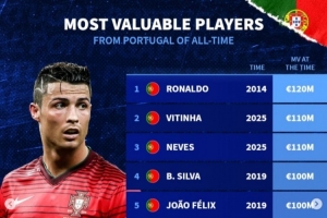 德转葡萄牙球员历史身价榜:C罗2014年1.2亿欧居首
