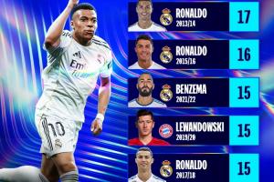 欧冠历史单赛季进球排行榜: